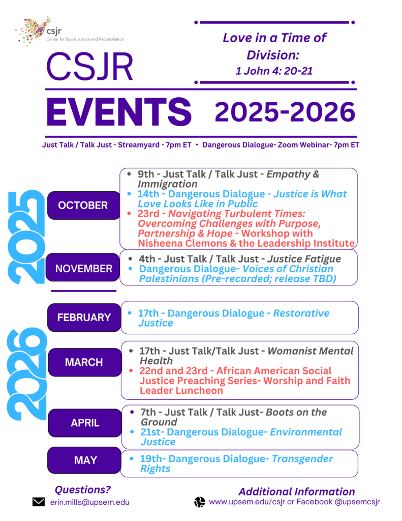 JustAct is the Center for Social Justice and Reconciliation’s ongoing conversation of justice, faith, and society. Resources are posted on the digital newsletter throughout the month. Sign up to receive our email newsletter to see the latest posts.
